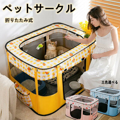 ペットサークル 折りたたみ ペットサークル 猫 ケージ 折りたたみ メッシュサークル 長方形 猫の分娩室 犬猫兼用 小型犬 室内 メッシュ 屋根付き アウトドア 組み立て簡単 収納バッグ付き ブルー イエロー ピンク XLサイズ 90*70*60CM