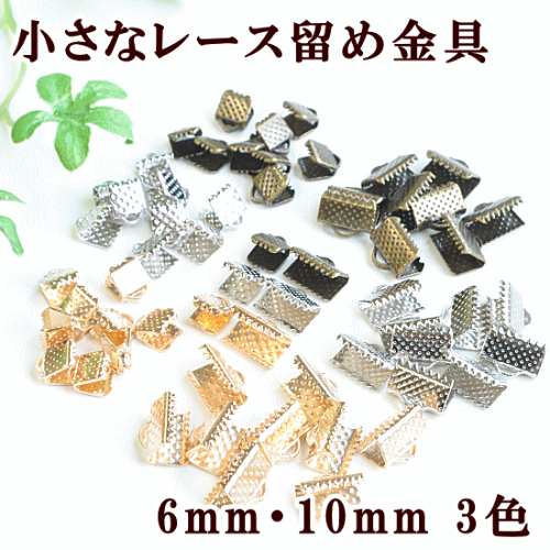 )小さなレース留め金具6mm/10mm 10個全3色リボン等の端を挟んで留めてくれるパーツレースやリボン、ひもなどを使ったアクセサリー作りに使用する金具です。