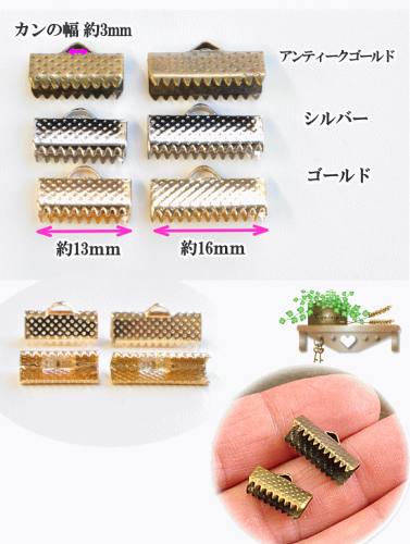 )レース留め金具13mm/16mm 10個全3色リボン等の端を挟んで留めてくれるパーツレースやリボン、ひもなどを使ったアクセサリー作りに使用する金具です。