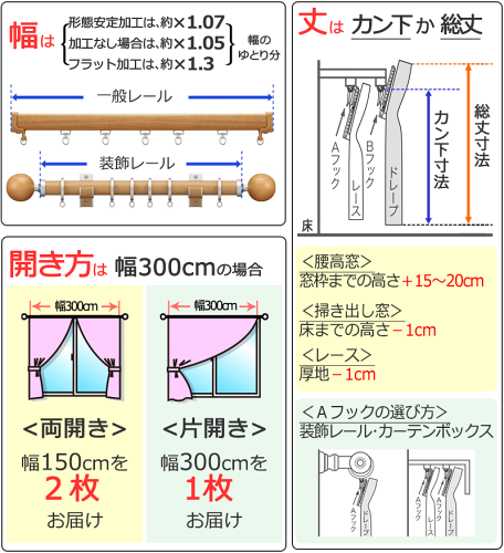 ドレープカーテンはBフック(レールが隠れる位置)、レースはAフック(レールが見える位置)でお届けします。