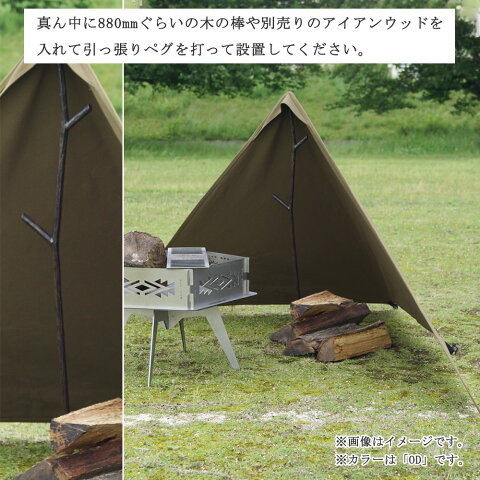 設営は、真ん中に880mmぐらいの木の棒、またはオプションのアイアンウッドを入れて引っ張りペグを打って完成です。